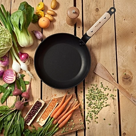 Le manche façon queue feuillard courbée à la française de la poêle 24 cm choc B Bois De Buyer est agrémenté de bois de hêtre des Vosges protégé à la cire d’abeille. Il simplifie sa prise en main et protège de la chaleur.
