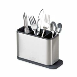 L’égouttoir à couverts en inox Surface vous permettra d’égoutter et faire sécher vos couverts au bord de votre évier. Le compartiment principal est divisé en 3 parties pour y mettre vos grands couverts. La dernière partie est moins profonde pour les petits éléments comme les petites cuillères. Le socle incliné est rainuré pour récupérer l’excédent d’eau avant d’être vidé par le bec verseur. Démontable, vous le laverez facilement à la main. Très élégant, il donnera une touche de modernité à votre cuisine.