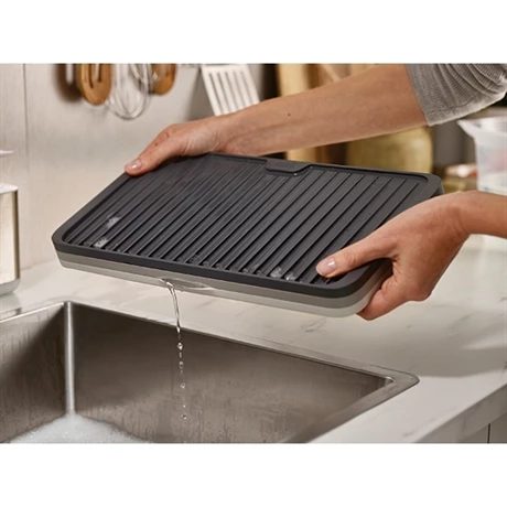 Le tapis de drainage extensible Joseph Joseph permet de sécher votre vaisselle n’importe : il récupère l’eau qu’il essore. Pour vider l’eau, un bec de drainage est intégré pour canaliser l’excès d’eau et verser directement dans l’évier. Le tapis de drainage offre une conception en 3 parties extensibles pour une plus grande capacité de drainage : la surface est idéale pour les tasses, les verres et les bols. Les nervures sont surélevées pour empêcher l’eau d’être piégée à l’intérieur des tasses, des verres etc. Rétractable, le tapis se replie pour un rangement facile.