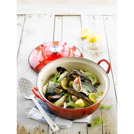 La fonte d’acier Ă©maillĂ©e de qualitĂ© utilisĂ©e permet une bonne rĂ©partition de la chaleur dans la cuve pour une cuisson douce et homogène de vos aliments.