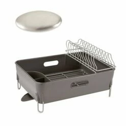 Idéal pour nettoyer votre vaisselle en toute simplicité, retrouvez dans ce lot un égouttoir à vaisselle et un savon d’acier !