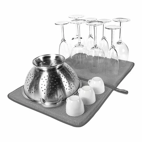 Le Tapis de séchage anti-bactérien gris est idéal pour les petites cuisines qui maquent d’espace. En micro fibres, il absorbe l’humidité et les chocs. Disposé sur votre plan de travail ou évier, il permet à votre vaisselle de sécher rapidement et aux gouttes d’eau d’être absorbées pour éviter les traces. Pratique, il se plie et se range facilement, dès que la vaisselle est sèche il ne reste plus qu’à le plier et le ranger dans un tiroir et récupérer de l’espace dans votre cuisine ! Résistant aux chocs, il évite toute casse accidentelle.