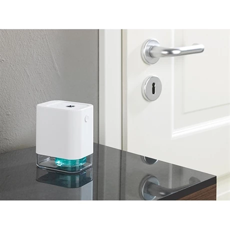Placé dans l’entrée, la cuisine ou le bureau, il désinfecte selon les besoins les mains des petits et des grands : il suffit de passer la main au-dessus du capteur pour qu’une brume désinfectante se diffuse. De cette manière, il peut également être utilisé comme distributeur de parfum.